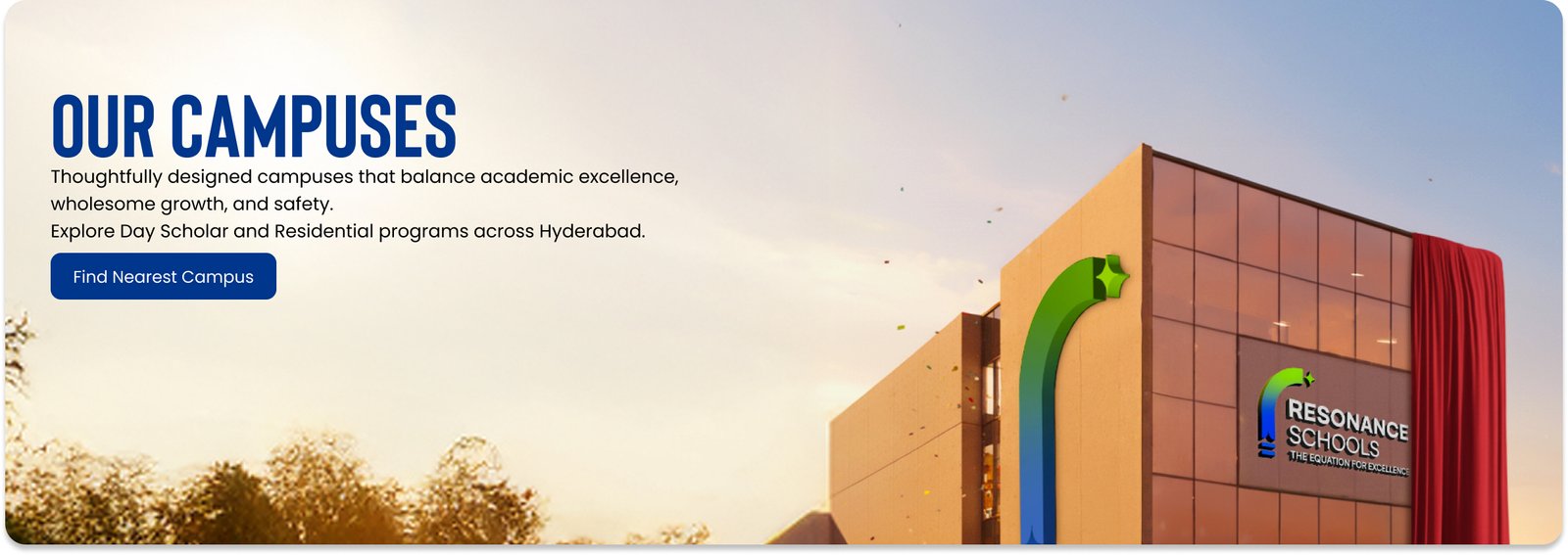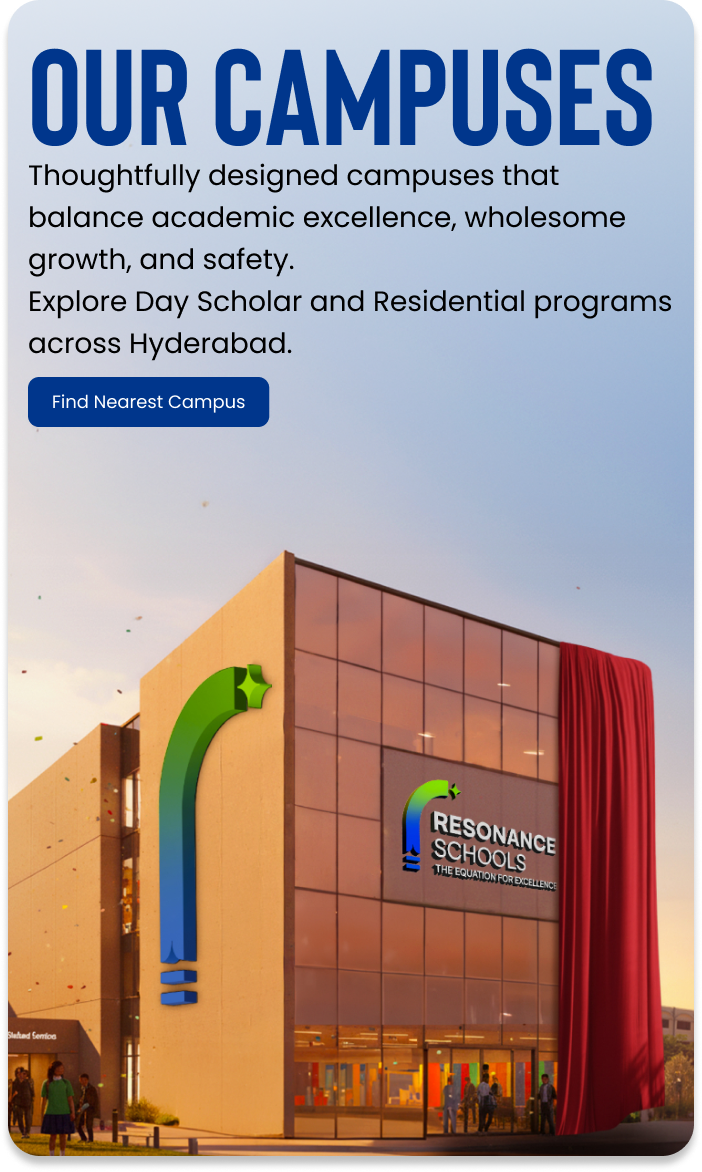 With 18+ strategically located campuses across Hyderabad, Resonance Schools provide inspiring learning environments that support academic excellence and personal growth. Every campus is equipped with smart, digitally enabled classrooms, advanced science and computer laboratories, dedicated sports and activity zones, and 24/7 CCTV-monitored safety systems ensuring students learn, grow, and thrive in a secure and enriching ecosystem.